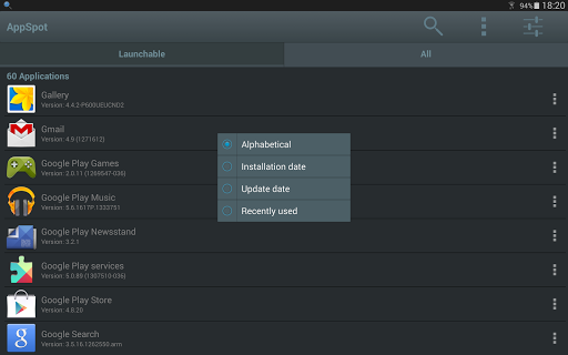 多種類型的應用程序,如:按字母順序排列,最近使用的,安裝日期,最近更新的。
