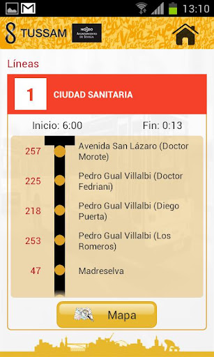 Ofrece información de las líneas de autobús y tranvía de TUSSAM, detallando sus recorridos y paradas de forma esquemática o sobre un mapa, y dando la estimación de tiempos reales de espera.