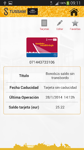 Por otra parte, se incluye la funcionalidad de consulta del título cargado en una tarjeta. Se podrá visualizar el saldo de un bonobús, o bien las fechas de validez para un bono temporal; igualmente se muestra la fecha de caducidad de la tarjeta, si existe. Pueden guardarse como favoritos los números de tarjeta que se deseen, para facilitar posteriores consultas.