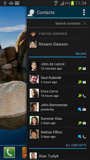 Quick access to your SMS conversations and your call log. The Contacts plugin will show you a list of recent conversations and call log. The amount of items to show can be configured from the options menu. You can also choose to show the message in case of an SMS text message or the phone number for call log items.