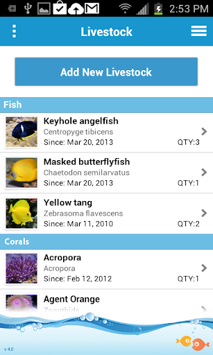 Aquarimate includes a very comprehensive livestock library called Aquaribase. You can browse or search Aquaribase to find information about your Freshwater and Saltwater livestock. This database includes thousands species of fish, corals, inverts and plants with pictures and information organized in categories for both Freshwater and Saltwater aquariums.