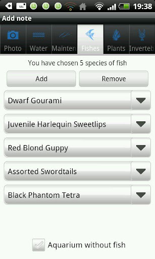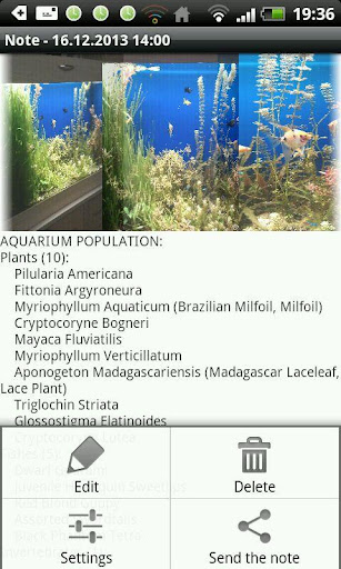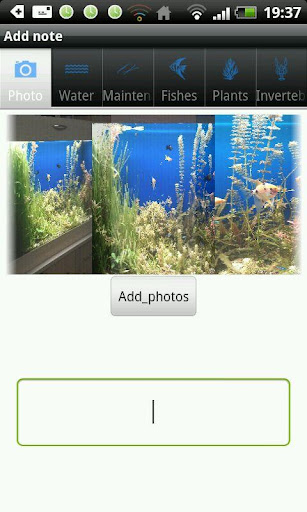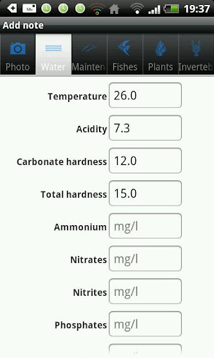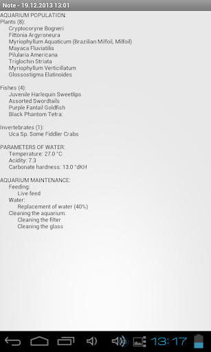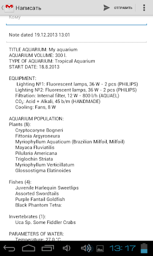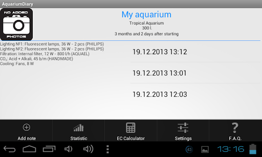 The program is designed to maintain a detailed diary of the aquarium. Here you can specify the parameters of the water, the species composition of fish, plants and invertebrates, for maintaining an aquarium and much more. Adding images to the notes will allow you to keep track of changing the appearance of the aquarium , including changes in the landscape, vegetation and inhabitants. The statistics module in graphic form will change over time of key indicators. Energy consumption calculator will allow you to calculate monthly and annual costs for the aquarium