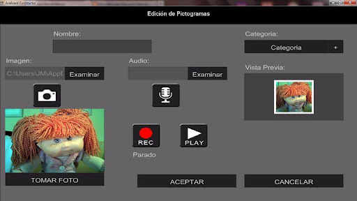 - Araboard Constructor: esta herramienta se utiliza para la creación y edicion de los tableros de comunicación. mediante la colección de pictogramas Arasaac y cualquier otra imagen y audio almacenados en el dispositivo.