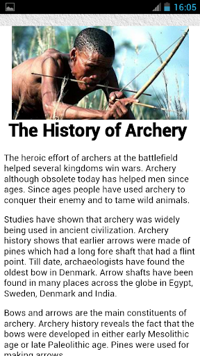 Bows and arrows are the main constituents of archery. Archery history reveals the fact that the bows were developed in either early Mesolithic age or late Paleolithic age. Pines were used for making arrows.