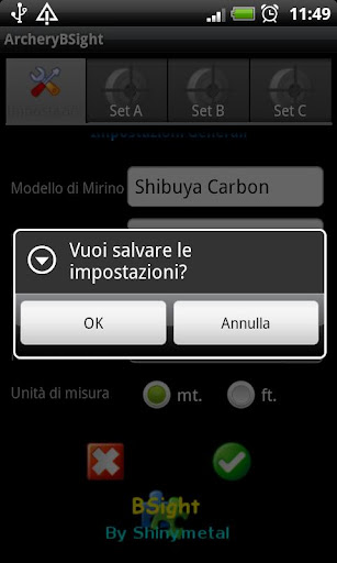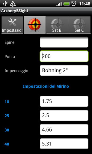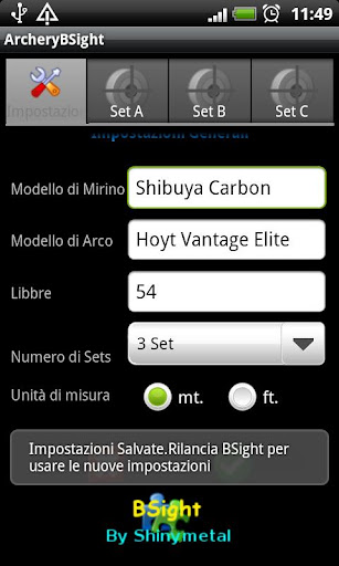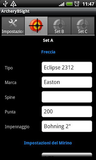 In the initial screen you can enter the bow data and viewfinder, the number of sets of target and the unity