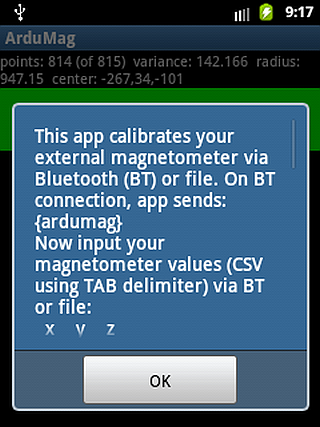 ArduMag calibrates your *external* magnetometer via Bluetooth (BT) or file. Works with any external MEMS 3 axis magnetometer (e.g. HMC5833L) connected to a microcontroller (e.g. Arduino). Send your raw data via Bluetooth or file and the app will calculate calibration parameters using Ellipsoid fitting method.