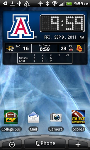 **7 Day Free Trial!** Official Arizona Wildcats Live Clock, with college football and basketball scores below the clock when games are in progress. This widget lets you replace the standard clock in your phone with a custom Arizona Wildcats clock, with instant access to scores, schedules and news (as well as other conferences). You don’t even need to open the app to see live scores—they appear automatically during live games. When no games are on, you’ll see the latest news headlines below the clock.