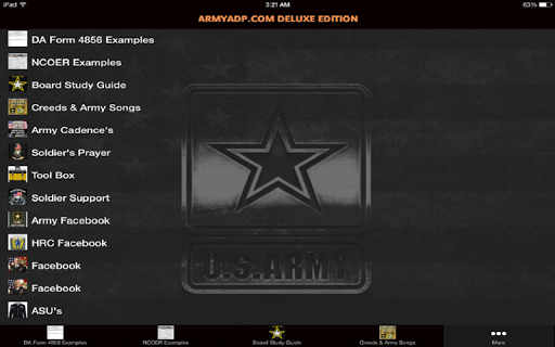 If you are an Army Soldier or Leader then this is the Must have App for You and Your Soldiers. ArmyADP.com Study Guide DELUXE Edition has more than just a Board Study Guide. It has all the tools to set You and Your Soldiers up for success. DA Form 4856 examples, NCOER bullet examples, NEW ADP& ADRP Army Board Study Guide (This is The most UP-To-Date Army Study Guide on the internet) Plus other Subjects: AR 600-20, AR 600-9, FM 7-22, Equal Opportunity, SHARP, ADP 6-22 and ADRP 6-22 and many more.(with More to Come and will be pushed out for Free to update your App), PRT Program Drills, Military Vehicle PMCS and PT Test Instructions for Each Event (Never have to run back to the Orderly Room again to grab the PT Book to read the Instructions for the APFT), Army Cadence's (recommend that you learn these and not be running while reading them from your phone) and more.