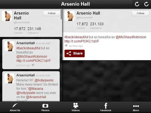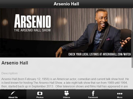 Arsenio Hall (born February 12, 1956) is an American actor, comedian and current talk show host. He is best known for hosting The Arsenio Hall Show, a late-night talk show that ran from 1989 until 1994, then, started back up in September 2013.
