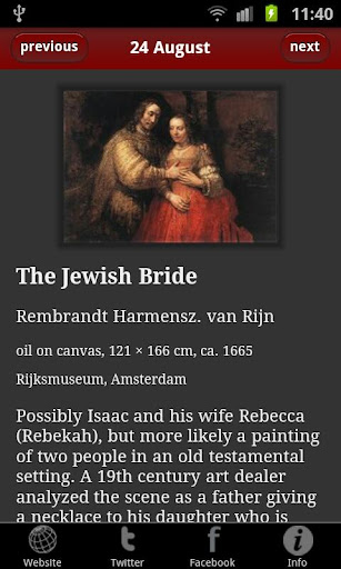 The app provides basic information on every featured work of art. Tap the image to view a larger version. Buttons enable easy sharing on Facebook or Twitter. Another button gives direct access to the full, online version of the painting and to the full description.