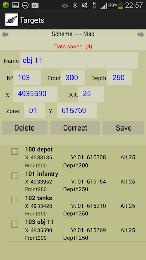 - topographical data of a fire task for the selected target (scheme and map).