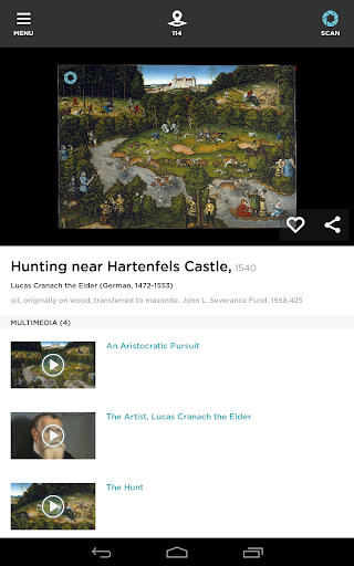 • Scanning – Employing innovative image recognition software, ArtLens can recognize artworks in the collection seamlessly, offering access to additional interpretive content. A special icon indicates which artworks have this feature. This content is only available on-site.