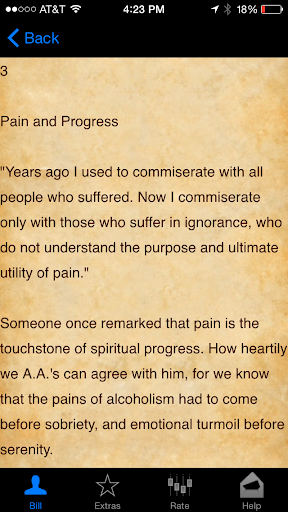 The app, "As Bill Sees It", delivers exactly what the title promises. This is a gleaning of the best thinking of the founder of AA. Whether you are well acquainted with AA literature, or simply a curious first time reader, this book is an excellent resource.