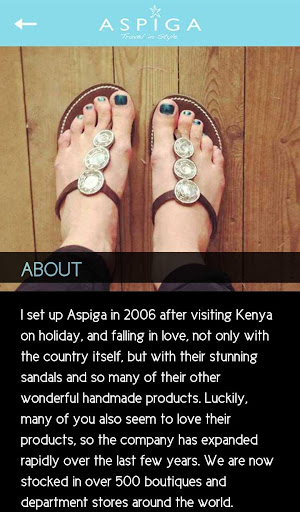 I set up Aspiga in 2006 after visiting Kenya on holiday, and falling in love, not only with the country itself, but with their stunning sandals and so many of their other wonderful handmade products. Luckily, many of you also seem to love their products, so the company has expanded rapidly over the last few years. We are now stocked in over 500 boutiques and department stores around the world.