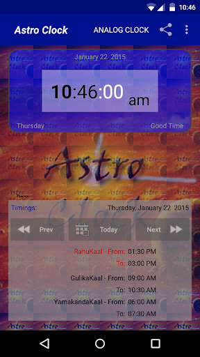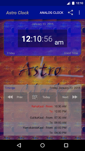 Astro Clock is an Astrological clock based on Indian Astrological timings like RahuKaal, GulikaKaal, and YamakandaKaal. It will inform you about the current status of the time, it might be an entry to Rahu/Gulika/Yamakanda-Kaal.