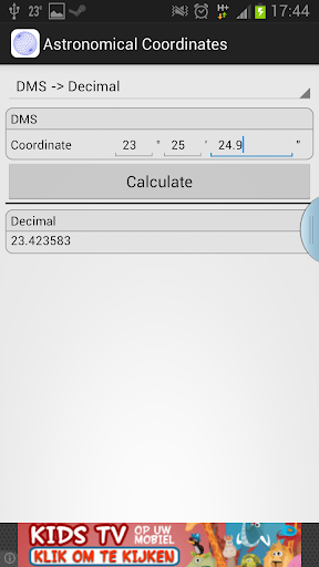 Convert coordinates between horizon, equatorial, ecliptic and galactic coordinates, as well as convert coordinates between DMS and decimal notation.