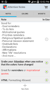 A unique home screen note Widget App! When you place a Note on your screen with this app the screen note automatically changes colors periodically! Your screen notes and reminders will always grab your attention.