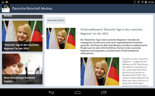 The German Foreign Office operates worldwide with a network of more than 230 German embassies. By this interactive and informative app most important news of the German Foreign Office and German embassies are quickly and comfortable accessible – regardless what time or country.