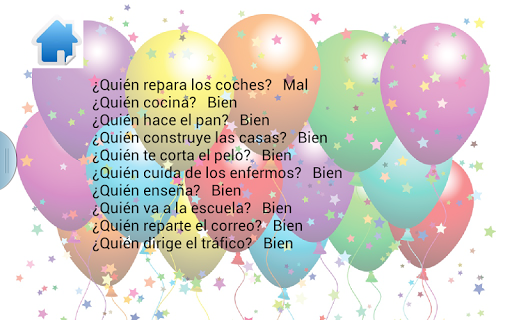 Se realizan una serie de preguntas básicas a las que el niño responde eligiendo la imagen apropiada. Al final, se muestra una tabla resumen para la toma de datos. Las opciones de voz de pregunta y respuesta son editables, para incrementar o disminuir la dificultad.