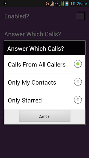 ---Answer which calls.You could select to answer whose call automatically.This app enables you to select all callers, contacts or only starred.