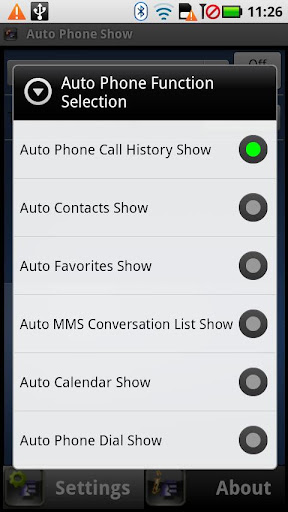 - Show Choice Mode: Phone Call History Show, Contacts Show, Favorites Show, MMS Conversation List Show, Calendar Show, Phone Dial Show