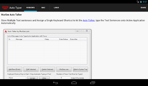 This Android App presents collections of Automated Text Typing Software Applications for Windows, Macintosh and Linux. The Information provided in this Auto Typer contains lots of screenshots and very less amount of text. This Android App requires internet connection and nothing else. You can easily browser through available information and even share the website address using the Android'd sharing mechanism to email or other applications.