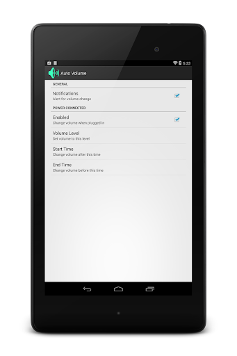 -Adjust volume when connected to power. Set the time of day window (such as going to bed).