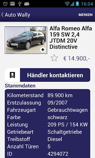 Suchen Sie Ihr neues Fahrzeug von unterwegs! Auto Wally bietet Ihnen alle aktuellen Fahrzeugangebote auf einer intuitiven und modernen Oberfläche. Blättern Sie durch mehrere und ständig aktuelle Fahrzeugangebote, speichern Sie interessante Fahrzeuge in Ihrer Merkliste ab und kontaktieren Sie die Verkaufsberater von der Auto Wally GmbH direkt über die App! Sie finden in unserem Fahrzeugangebot vorwiegend junge Gebrauchtwagen aus Erstbesitz mit wenig Kilometerleistung. Unsere Fahrzeuge sind vorwiegend von österreichischen Leasingfirmen mit vollständigen Servicenachweisen. Die Auto Wally App bietet Ihnen folgende Funktionen für Ihr Smartphone:
