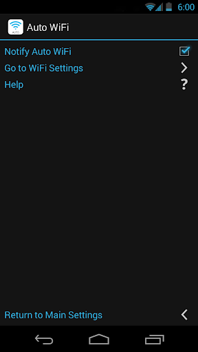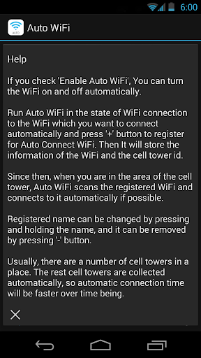 자동 접속할 와이파이에 접속 후 Auto WiFi를 실행하고 자동 접속 와이파이에 등록하십시오. 이후 그 장소에 가면 자동으로 와이파이가 켜지면서 접속을 하고, 그 장소에서 벗어나면 접속이 해제되면서 자동으로 와이파이가 꺼집니다.