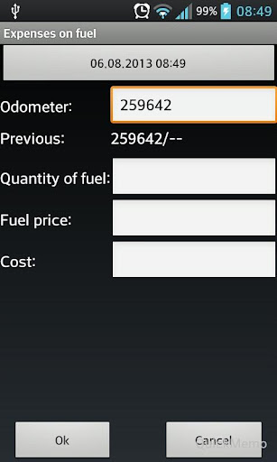 To be entered either volume of fuel or the paid total (automatic recomputation of other field, it is possible to edit then and this field, will be enumerated previous)