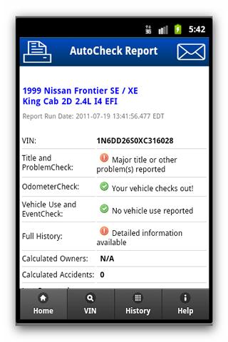 AutoCheck users can now access AutoCheck vehicle history reports from their mobile device. After downloading and launching the application, log in using your email and password to enter a VIN to request a report, review your vehicle report history and email customer service. If you do not have an account with AutoCheck, follow the link on the main page to subscribe to the service.