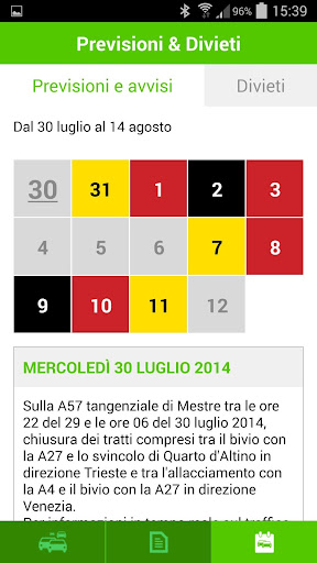 Calendario con le previsioni del traffico a 14 giorni. Ogni turbativa prevista alla normale circolazione autostradale è contraddistinta da un diverso colore: