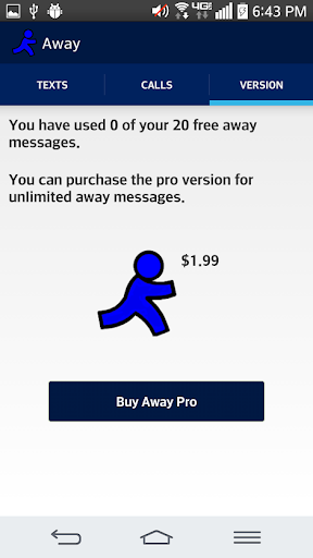 Away allows you to set an away message to automatically reply to incoming text messages and phone calls. You can create a separate message for incoming text messages and incoming calls. Away also allows you to set corresponding alarms to disabled your away messages at a time you see fit.
