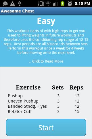 Stand out from the crowd with an impressive and well-shaped chest. Awesome chest provides you with a carefully selected set of exercises to help give you amazing all round chest development from the comfort of your own home. The user friendly interface lets you start your workout at the push of a button without complicated inputs beforehand. Let awesome chest help you reach your fitness and physique goals now.