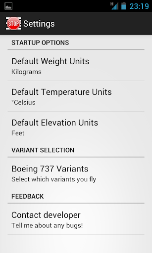 The app uses degrees Celsius, kilograms and elevations in feet as standard however you can toggle to Fahrenheit, pounds and metres. These options can be saved from the settings screen. When using other than the standard units there may be some small differences to the QRH figures due to rounding. If you find any significant differences let me know.