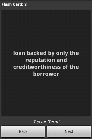 Banking & Financial Terminolgy quizzes, flash cards, and a dictionary of over 500+ terms makes the perfect study partner. This handy Android app from Little Apps keeps your user interface simple and straightforward; the only complex aspect of this app is the content itself. Challenge your knowledge with multiple choice quizzes which show you the correct answer if you miss a question. Research terms you don't know with the specialized dictionary. Study for upcoming tests and master your finance knowledge with term-by-term flash cards. The Banking & Financial Terminology Quiz (Flash Cards & Dictionary), made for students on the go with Android phones, applies a simple, easy-to-use structure to a particularly rich and amazing subject.
