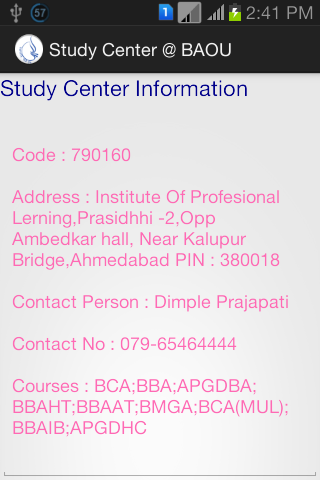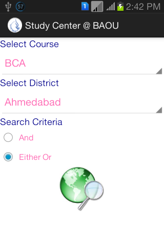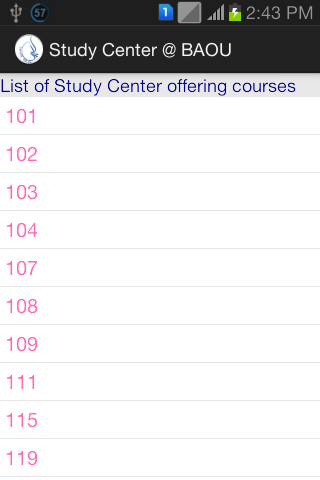 This app provide facility to locate study center based on courses they offer and/or city in which it is located. Once study centers are located user can find useful information such as center code, contact person, contact number, address and all courses offered by that center.
