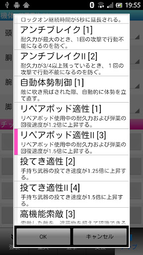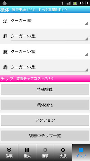 - 機体パーツ選択リストにはパーツのステータスを同時に表示します。