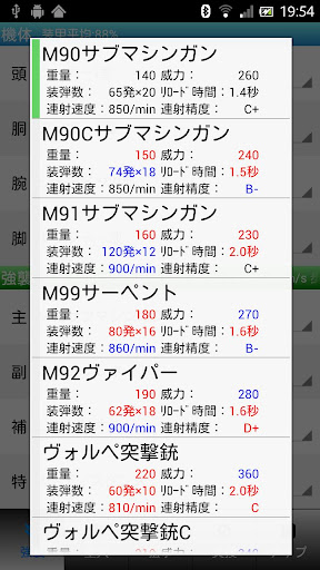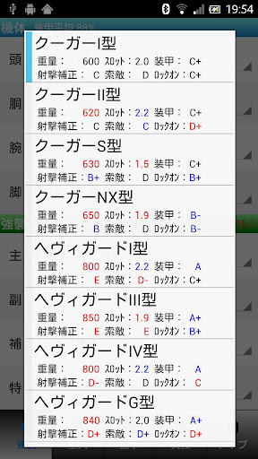 - パーツ選択リストにはパーツの重量のみの表示と簡易ステータス表示の2種類があります、オプションメニューの「設定」から変更できます。
