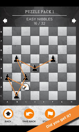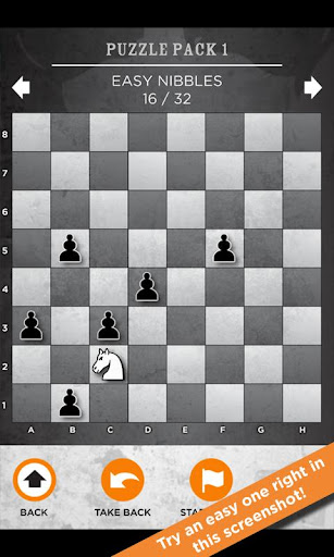Take is simple to play. In each puzzle, use the white piece to take all the black pawns. The black pawns do not move. There is one catch: every move you make must capture a pawn. That is it, you are ready to play! Check the screenshots to do your first puzzle!