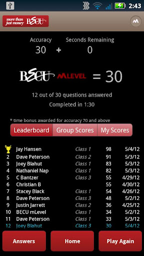 BECU has partnered with Slalom Consulting to offer an innovative mobile application that reinforces financial literacy topics taught by BECU educators with Gamification techniques. The app augments instructor led classroom presentations by BECU educators. The BECU mLevel Challenge has a series of 90 second games and a leaderboard showing who has the top scores. Application features include: