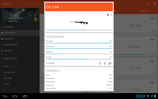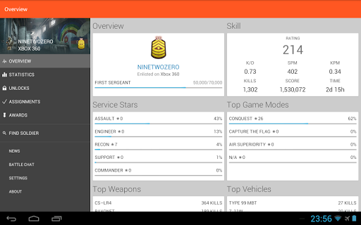 BF4 Intel is your most trusted companion on the Battlefield regardless of the platform you're playing on, or how many people you have in your party. Currently you can view your statistics, unlocks, assignments and awards, plus the added feature to view the latest Battlelog news! Most people have their phones next to them while playing, making this the ultimate app for all of you gamers out there - you won't need to have your laptop switched on as a console player, just for the sake of Battlelog. You don't need to alt-tab the game to look up your current unlocks, and miss important in-game opportunities. Just open the app, check what you need and play your best rounds ever.