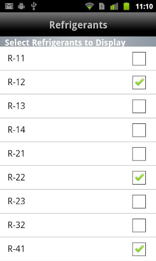Each refrigerant that has a checkmark will be available to view from the main screen (and represented by a “dot”).