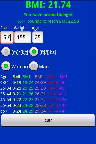 This app calculates your BMI (Body Mass Index) and gives you an idea what it means. The calculation depends on your age, gender, size and weight. BMI Calc also returns you an amount of Kg what you have less or too much to reach a normal BMI.