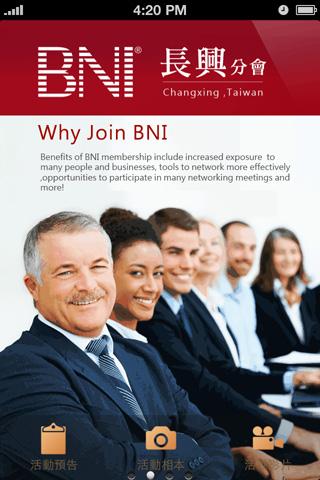 本APP是BNI台灣長興分會的專屬APP,可讓使用者進一步瞭解BNI、認識本分會,也提供分會成員一個資訊交流的平台。