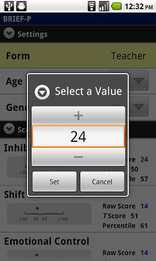 This module provides conversion of BRIEF-P Parent and Teach Raw Scores to T Scores. The T Scores are also displayed relative to the population as well as their percentile.