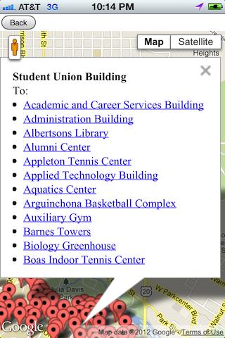 Your position is shown on the map along with all of the campus buildings. Tapping on a building will bring up a list of other buildings to choose from indicating your destination. It will display four walking speeds and the time (in minutes) it will take to walk to the chosen building from the selected list.