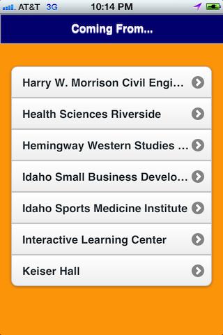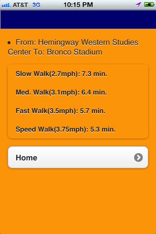 This app is specifically designed to show Boise State University students about how long it will take to walk from one campus building to another based on walking speed (2.7, 3.1, 3.5, or 3.75 mph). Most colleges allow only 10 minutes between courses and sometimes it takes longer than that to get to the next class.