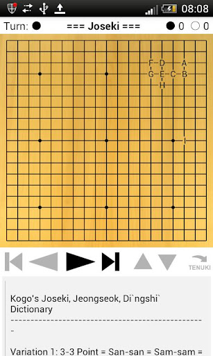 - Game review/study: replay a game on the board while the app only accepts the game moves. Ask for hint: show 5x5 square containing next move (size adjustable in settings)