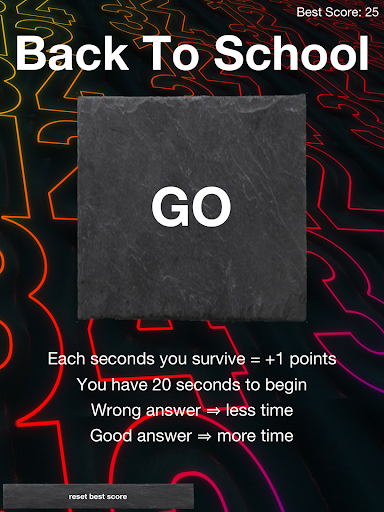"Back To School" is a Math Test practice game, free Maths Quiz for kids too in grade 7, 8, 9, 10, 11. Free math practice test activity for middle school, high school kids.